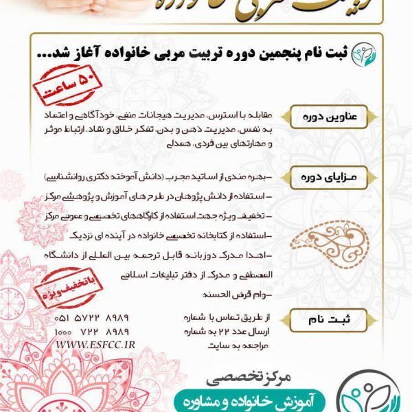 ما با بهرهمندی از مشاوران متخصص حوزه خانواده ، برای مشاوره و آموزش مهارتهای زندگی و استعدادیابی فرزندان دلبندتان در کنار شماییم. با اعطای گواهی بین المللی دو زبانه شما لایق زندگی آرام و بدون دغدغه هستید. با ما تماس بگیرید: ۰۵۱-۵۷۲۲۸۹۸۹ ... ادامه مطلب